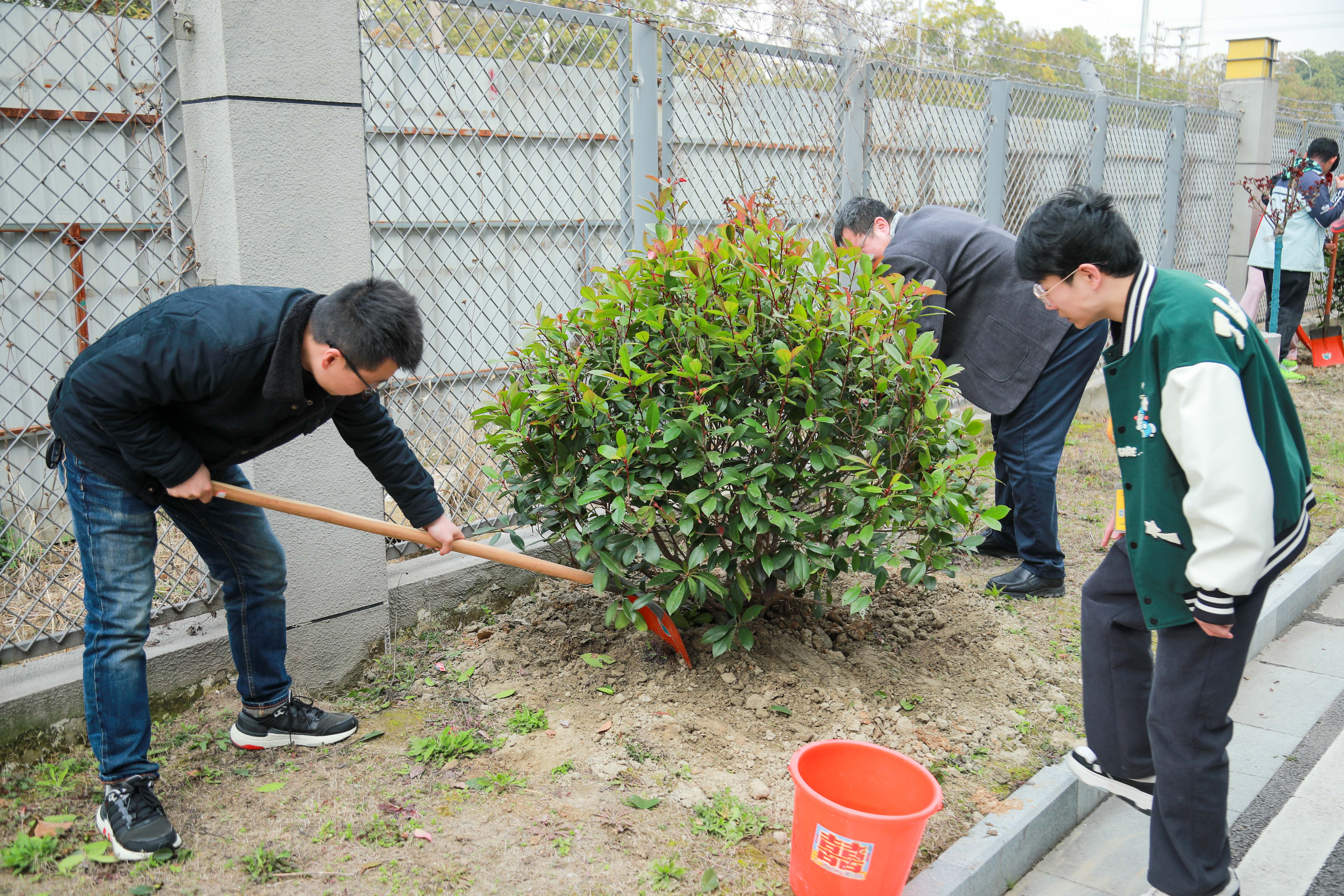 植樹環(huán)節(jié)正式開始,3-4人一組。大家團結一致、密切配合,揮鍬鏟土、扶苗培土、壓緊踩實、提水澆灌,小心翼翼地對待著每一棵樹。經過一個小時的辛勤勞動,隨著29棵紅葉石楠球逐漸挺立,生產樓西面院墻變得生機勃勃,一股成就感不由得在伙伴們的心中升騰起來。大家爭相與自己的“杰作”合影留念,并表示要?;貋砜纯醋约悍N下的樹。
